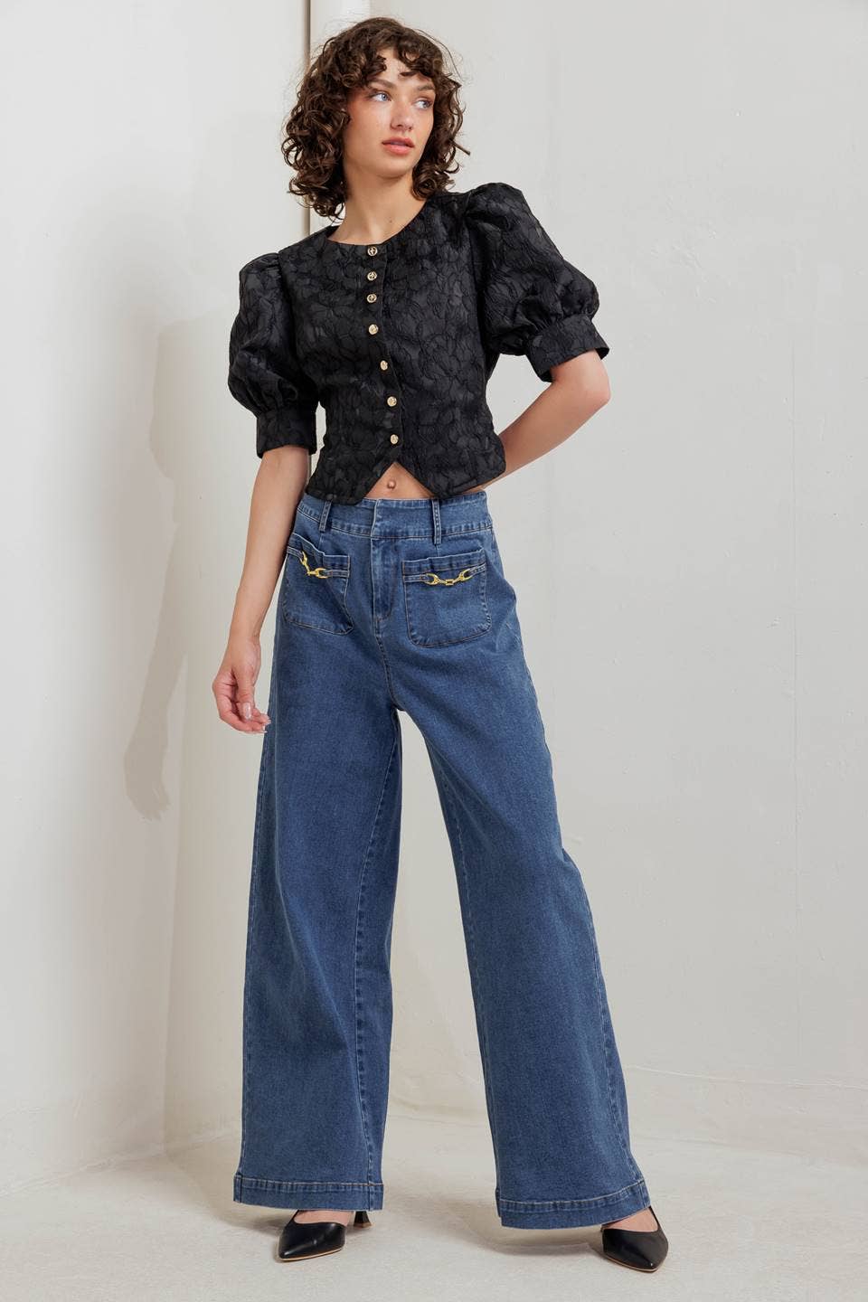 A textured woven top featuring round neckline, short puff sleeve with cuff and front button down closure