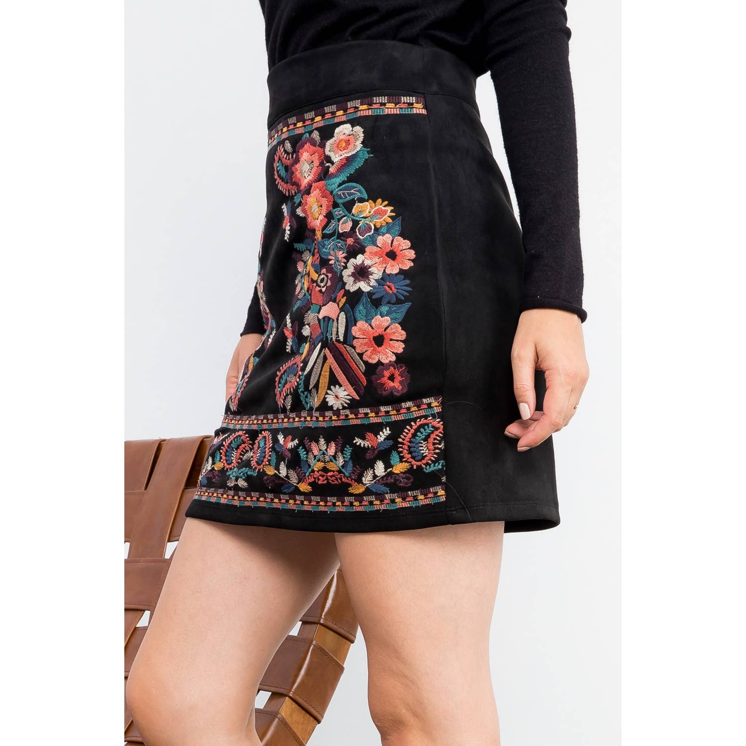 Black Suede Knit Skirt with Colorful Embroidered Detail: BLACK