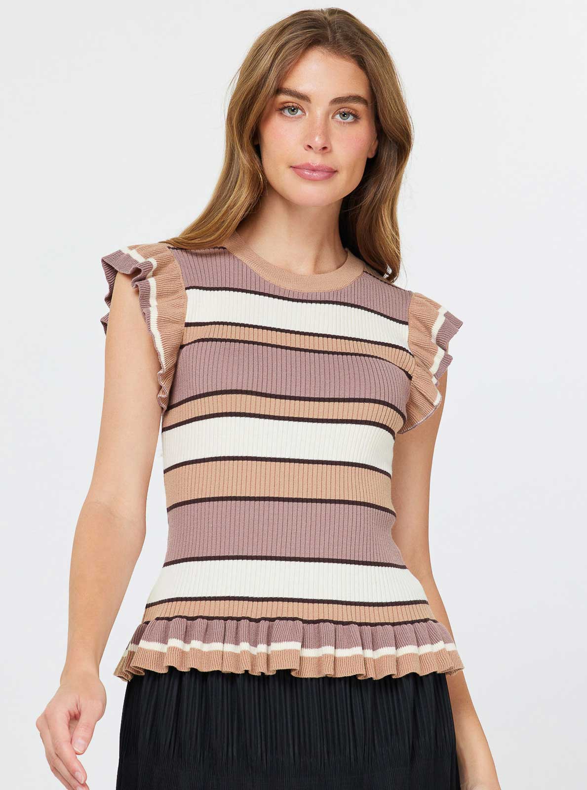 A Sweater top with peplum ruffle hem and colorful stripes for a charming everyday look.
