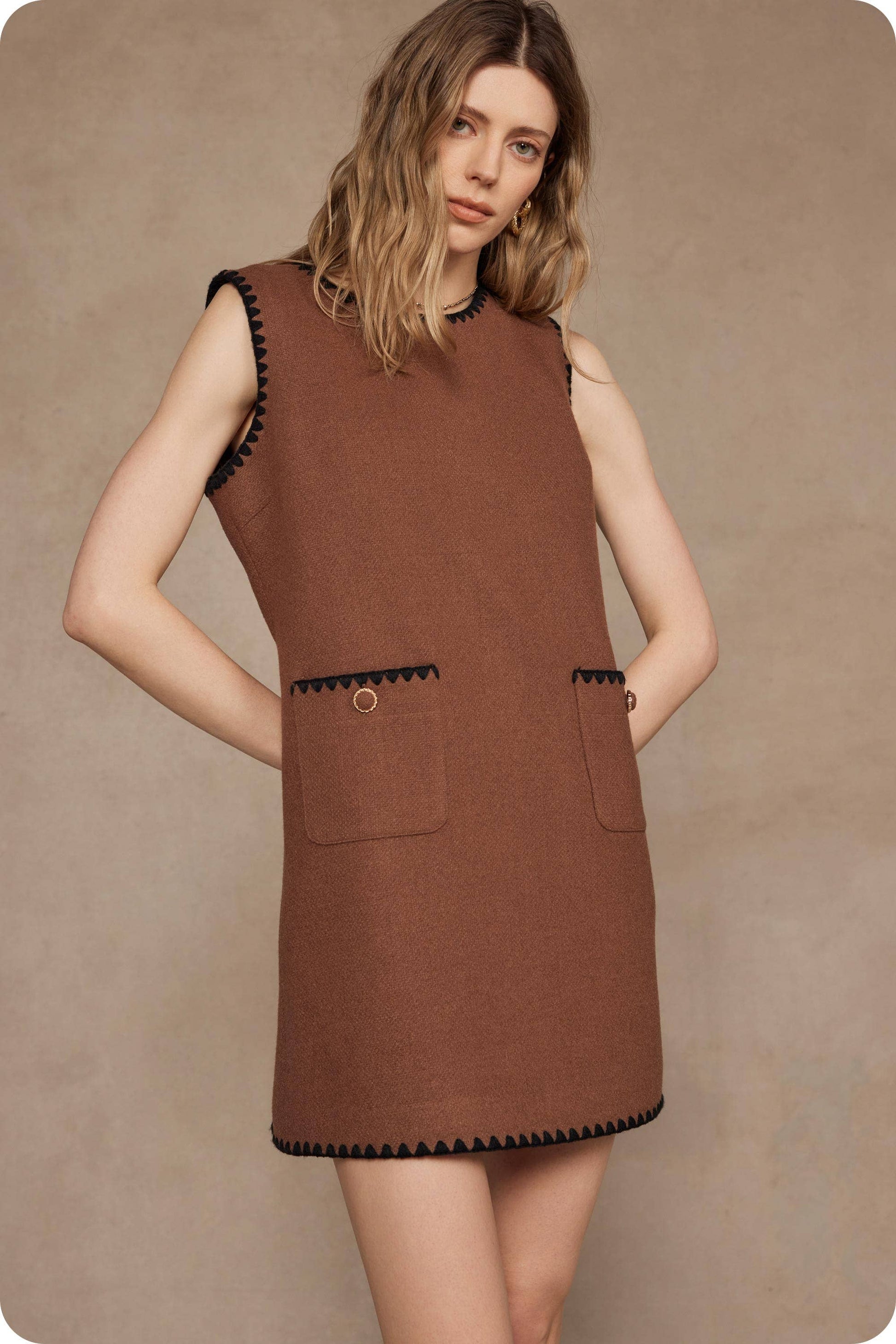 Studio Strut and Bolt Collection. Sleeveless contrast embroidery detail mini dress in boucle fabric. This timeless chic dress features embroidered edge detail throughout, front pockets, vintage-inspired buttons, round neckline, and a tailored silhouette.